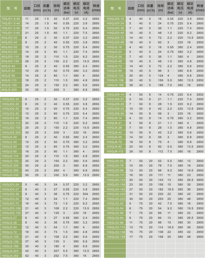 產(chǎn)品用途為水井或水庫(kù)抽水,適用于家庭,市民和工業(yè)。還適用于花園和農(nóng)田灌溉。水質(zhì)要求:1、一般無腐蝕性清水;2、水中固體物質(zhì)含量不能超過0.01%(重量比);3、酸堿度PH值在6.5-8.5范圍內(nèi);4、水溫不高于200℃。電源:變壓器距離井較遠(yuǎn)時(shí),應(yīng)考慮輸入電線壓降,要求變壓器到井口距離不超過20m,大于20m時(shí),要求輸電線規(guī)格比原配電纜規(guī)格大兩個(gè)的等級(jí),并考慮線壓降。型號(hào)意義